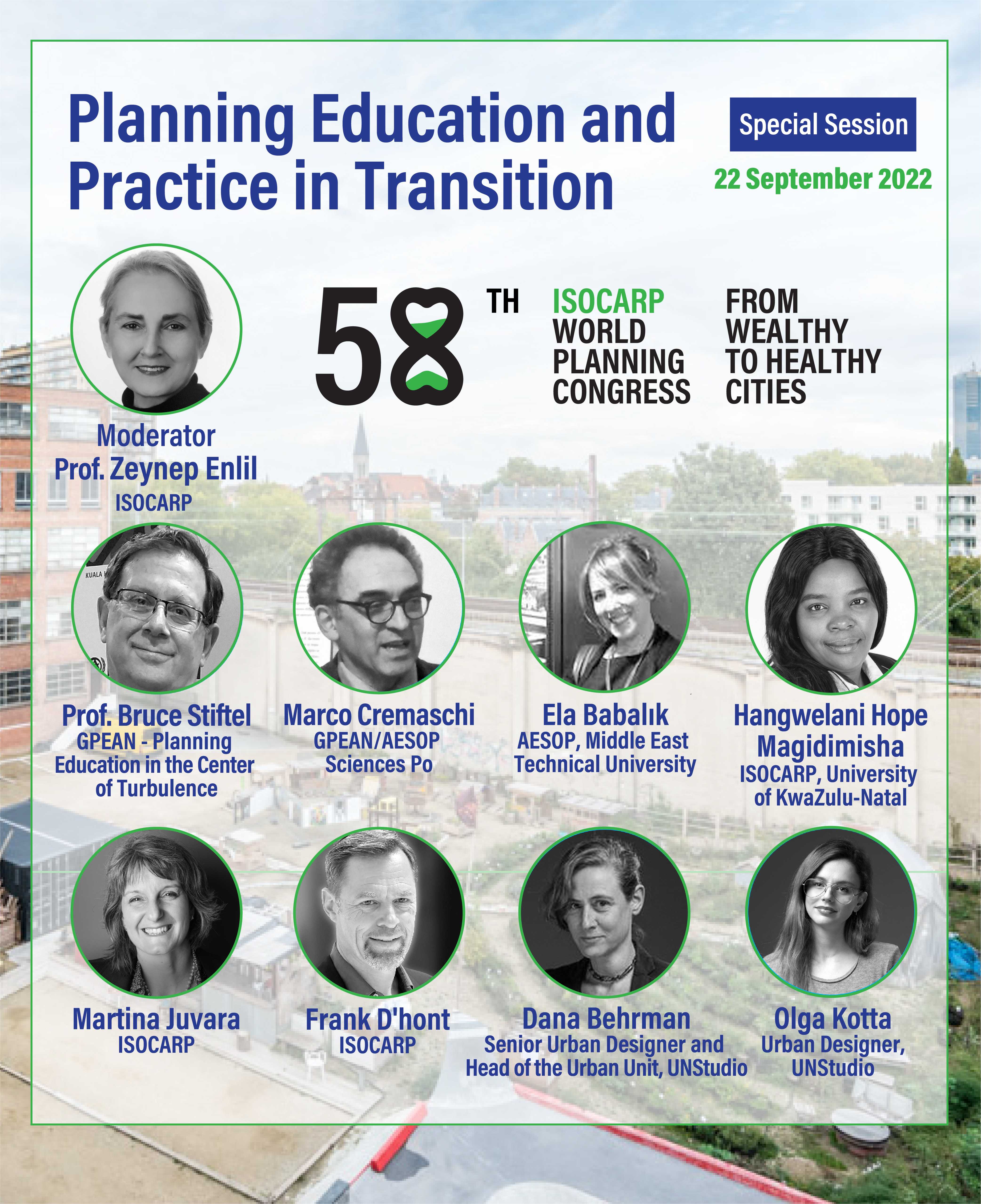 This special session on "Planning Education and Practice in Transition" organized by ISOCARP in collaboration with Global Planning Education Association Network (GPEAN) and the Association of European Schools of Planning (AESOP) brings together planning practitioners and educators in order to discuss the challenges ahead of us with the aim to think together and co-create a new planning agenda for urban health, socio-spatial justice and climate resilience.
